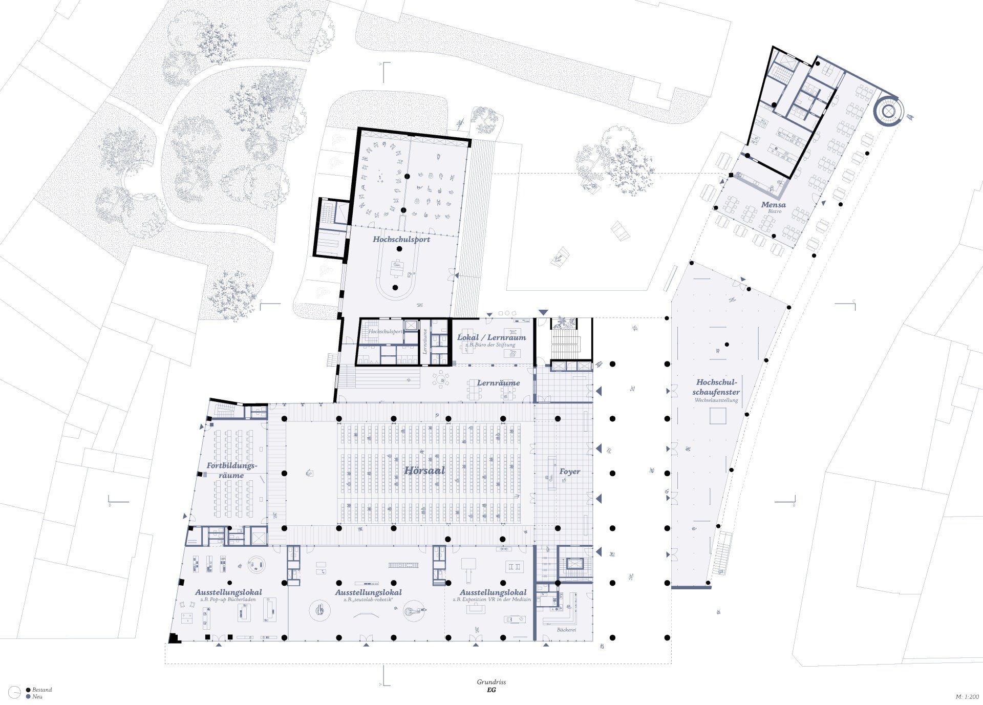 Das Konzept zur Umnutzung des Warenhauses beruht dabei auf der Nutzung als Hochschulhaus. Das Gebäude in Bielefeld besitzt, wie viele andere Warenhäuser, eine große Bedeutung für die Innenstadt: einerseits historisch, worauf die große mediale Aufmerksamkeit hinweist, und andererseits als ein die Innenstadt belebender Ort, auch wenn diese Funktion heute abgeklungen ist. Alleine zu diesem einen Karstadt Gebäude fanden sich im Zuge der Recherche über 135 Zeitungsartikel. Ziel war es daher, wieder ein Haus von Bedeutung und mit einer lebendigen Erdgeschosszone zu gestalten. Es soll ein gemeinsamer, repräsentativer Standort für alle 6 Hochschulen der Stadt entstehen. Die sehr kontextspezifische Neuschöpfung eines Hochschulhauses in Bielefeld beinhaltet Wohnen, je ein Büro für jede Hochschule, Hochschulsport, einen Hörsaal und Ausstellungslokale.